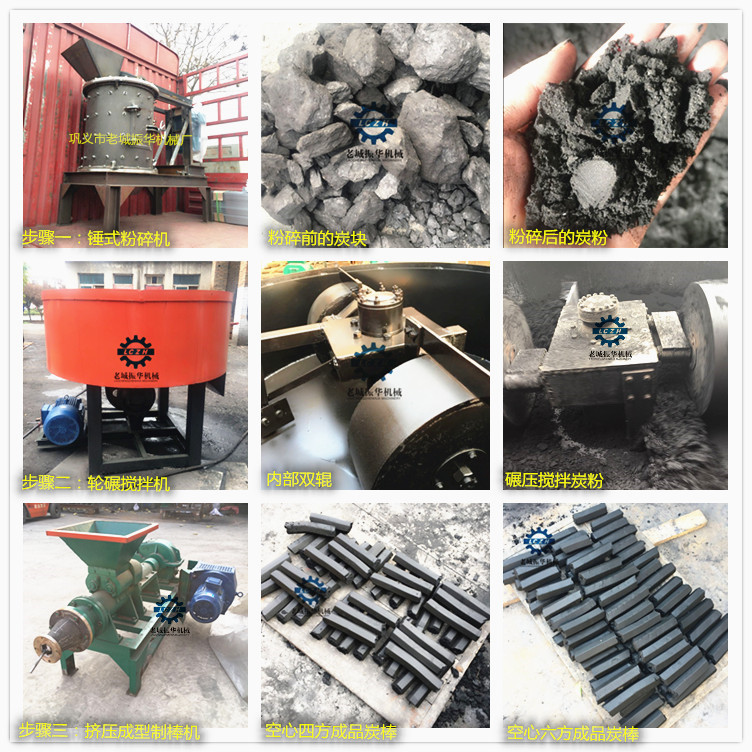 先准备好原材料炭块、炭渣——先将炭块、炭渣使用粉碎机粉碎成粉状的他那份——然后在炭粉里加入适当的粘合剂和水分使用轮碾搅拌机搅拌均匀后——再然后用制棒机成型制棒——制出的成品棒晾晒后打包装箱即可;