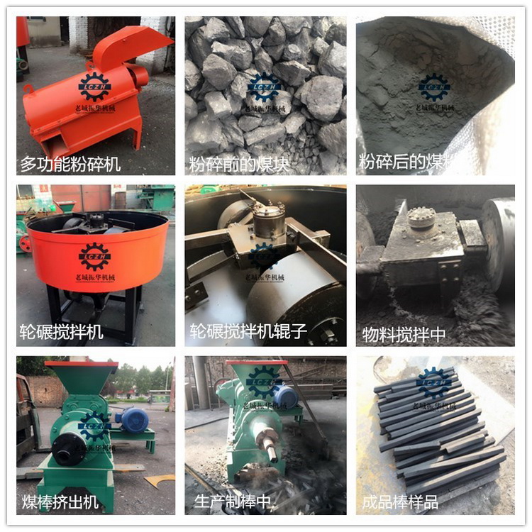 先准备好用户所需的原材料煤块——然后将煤块使用多功能粉碎机粉碎成粉状的煤粉——接下来在煤粉里加入适当的粘合剂和水分充分利用轮碾搅拌机搅拌均匀后——再将搅拌好的煤粉使用煤棒挤出机螺旋挤压的原理,制出理想的高压煤棒——制出的成品煤棒晾晒后打包装箱即可;