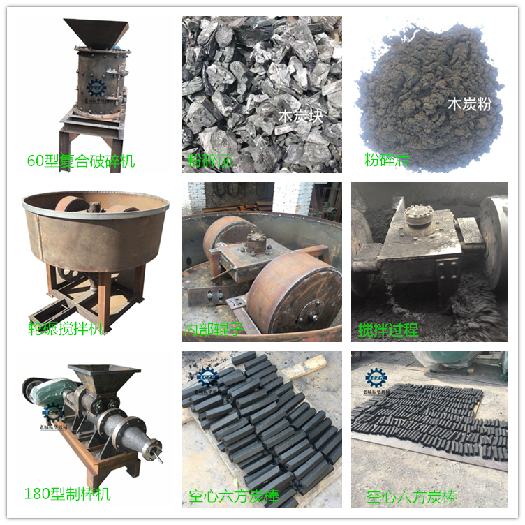 先准备好原材料木炭渣——先将木炭渣使用立式粉碎机粉碎好——再然后在粉碎好的炭粉里加入适当的粘合剂和水分使用轮碾搅拌机搅拌均匀后——再将搅拌好的炭粉使用制棒机(煤棒机、炭粉成型机)挤压制棒——制出的成品炭棒晾晒后打包装箱即可;