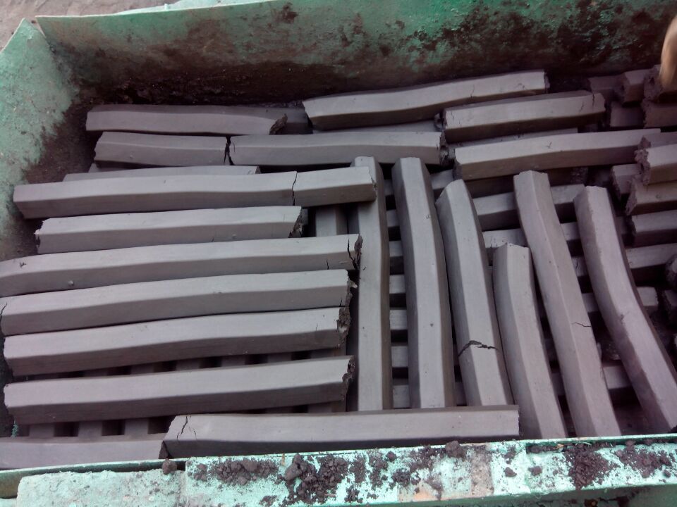 图中显示的是:140型炭粉成型机制出的成品棒现场图;成品棒规格:空心六棱