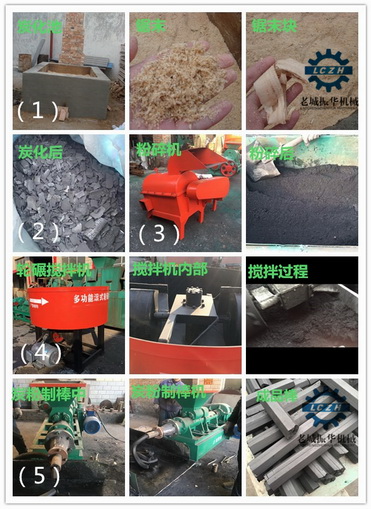 1、原料(炭粉)——粉碎机粉碎——轮碾机搅拌——炭粉成型机成型制棒——成品晾晒后打包装箱;