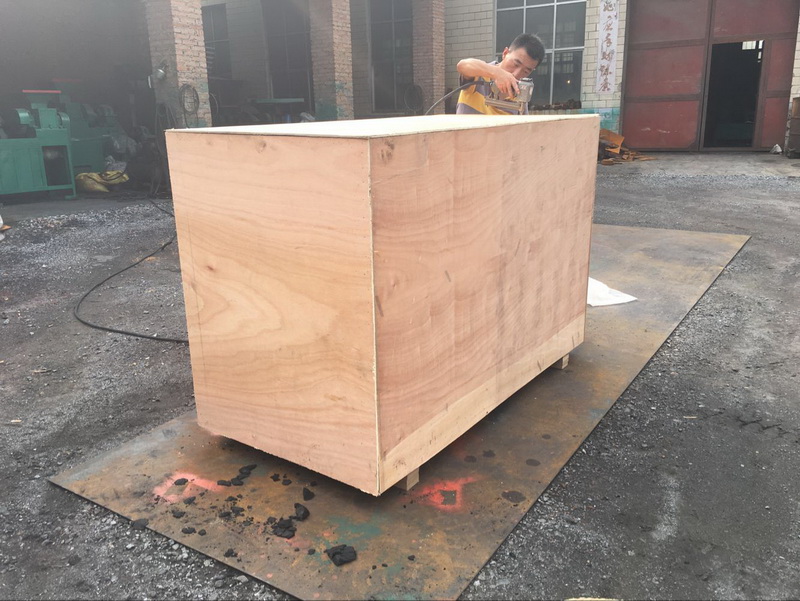 图1、2为:140型煤粉制棒机木箱包装现场;